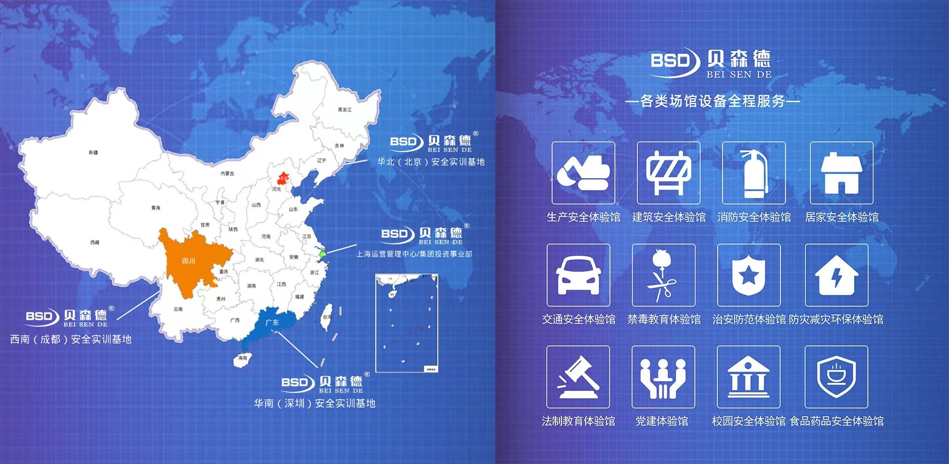 貝森德旗下有:貝森德、貝創(chuàng)科技、瓦令科技等品牌,主營(yíng)業(yè)務(wù)由:體驗(yàn)式教育服務(wù)、綠色環(huán)保服務(wù)等構(gòu)成。 提供各類場(chǎng)館設(shè)備全程服務(wù):消防體驗(yàn)館、消防安全體驗(yàn)館、生產(chǎn)安全體驗(yàn)館、建筑安全體驗(yàn)館、居家安全體驗(yàn)館、交通安全體驗(yàn)館、工地安全體驗(yàn)館、VR安全體驗(yàn)館、校園安全體驗(yàn)館、食品藥品安全體驗(yàn)館、安全教育體驗(yàn)館、禁毒體驗(yàn)館、禁毒教育體驗(yàn)館、治安防范體驗(yàn)館、防災(zāi)減災(zāi)體驗(yàn)館、法制教育體驗(yàn)館、黨建體驗(yàn)館、模擬滅火體驗(yàn)、安全體驗(yàn)教室等。業(yè)務(wù)覆蓋全國(guó),主要覆蓋上海、北京、深圳、四川成都、浙江、江蘇、云南等地。